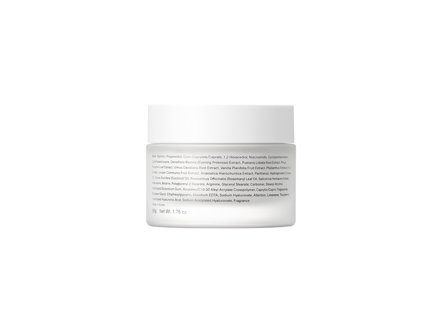 水、グリセリン、プロパンジオール、(カプリル酸/カプリン酸)ヤシアルキル、1,2-ヘキサンジオール、ナイアシンアミド、シクロペンタシロキサン、シクロヘキサシロキサン、メマツヨイグサ花エキス、クズ根エキス、ダイオウショウ葉エキス、ウルムスダビディアナ根エキス、バニラ果実エキス、アンマロク果実エキス、セイヨウネズエキス、アンザンジュエキス、パンテノール、水添ヤシ油、ヤシ油、ローズマリー油、アッケシソウエキス、アデノシン、ベタイン、ステアリン酸ポリグリセリル-2、アルギニン、ステアリン酸グリセリル、カルボマー、ステアリルアルコール、加水分解スクレロチウムガム、(アクリレーツ/アクリル酸アルキル(C10-30))クロスポリマー、トリ(カプリル酸/カプリン酸)グリセリル、BG、エチルヘキシルグリセリン、EDTA-2Na、ヒアルロン酸Na、アラントイン、リモネン、トコフェロール、加水分解ヒアルロン酸、アセチルヒアルロン酸Na、香料